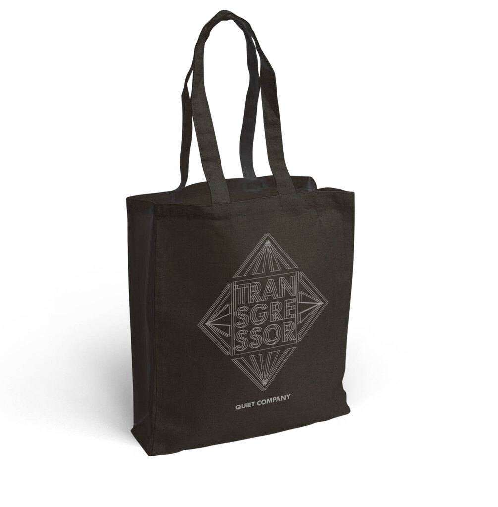 Black tote bag with Grey Transgressor logo. This can hold your Transgressor vinyl or your Transgressor CD, or both your Transgressor vinyl & CD while also carrying all of your other Quiet Company albums. Or you could use it to hold other stuff.